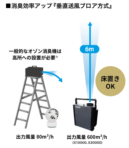 「下から上へ」という空気の道を作ることで、床に置いたまま、客室空間、全体を効率よく消臭します。
